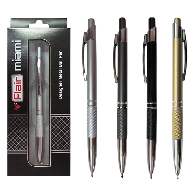 Ручка масляная автоматическая Flair MIAMI, в блестящем металлическом корпусе с хромированными деталями, с синими чернилами на масляной основе.