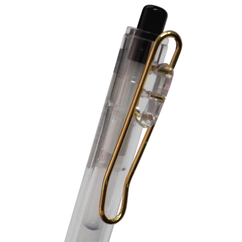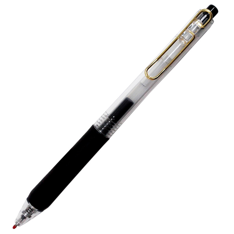 Автоматическая гелевая черная ручка в прозрачном корпусе с прорезиненной областью захвата и металлическим клипом.