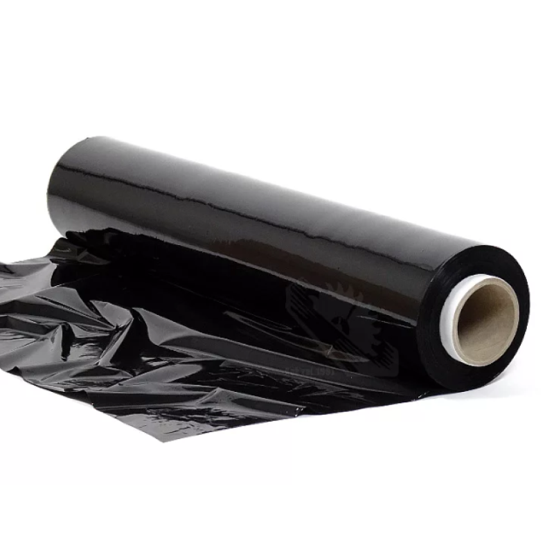 Стрейч-плёнка. Цвет ― Черный, ширина плёнки составляет 500 мм, намотка 300 метров, толщина 23 мкм, а вес рулона нетто 2 кг.